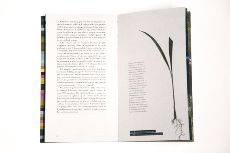 Acredita-se que a primeira muda de palmeira-imperial – a Palma Mater – tenha sido plantada no Jardim Botânico na primeira década do século XIX. Desde então, esses habitantes centenários são associados à imagem do Jardim, e sucessivas gerações de profissionais têm se dedicado à sua preservação. Esta publicação trata do Projeto de revitalização das aleias de palmeiras-imperiais responsável por tratamentos fitossanitários e replantios realizados entre 2008 e 2009, e incorpora informações científicas e aspectos simbólicos e históricos acerca dessa planta emblemática que se disseminou por todo o Brasil como elemento qualificador de suas paisagens. Publicado em parceria com o Jardim Botânico do Rio de Janeiro em 2009.